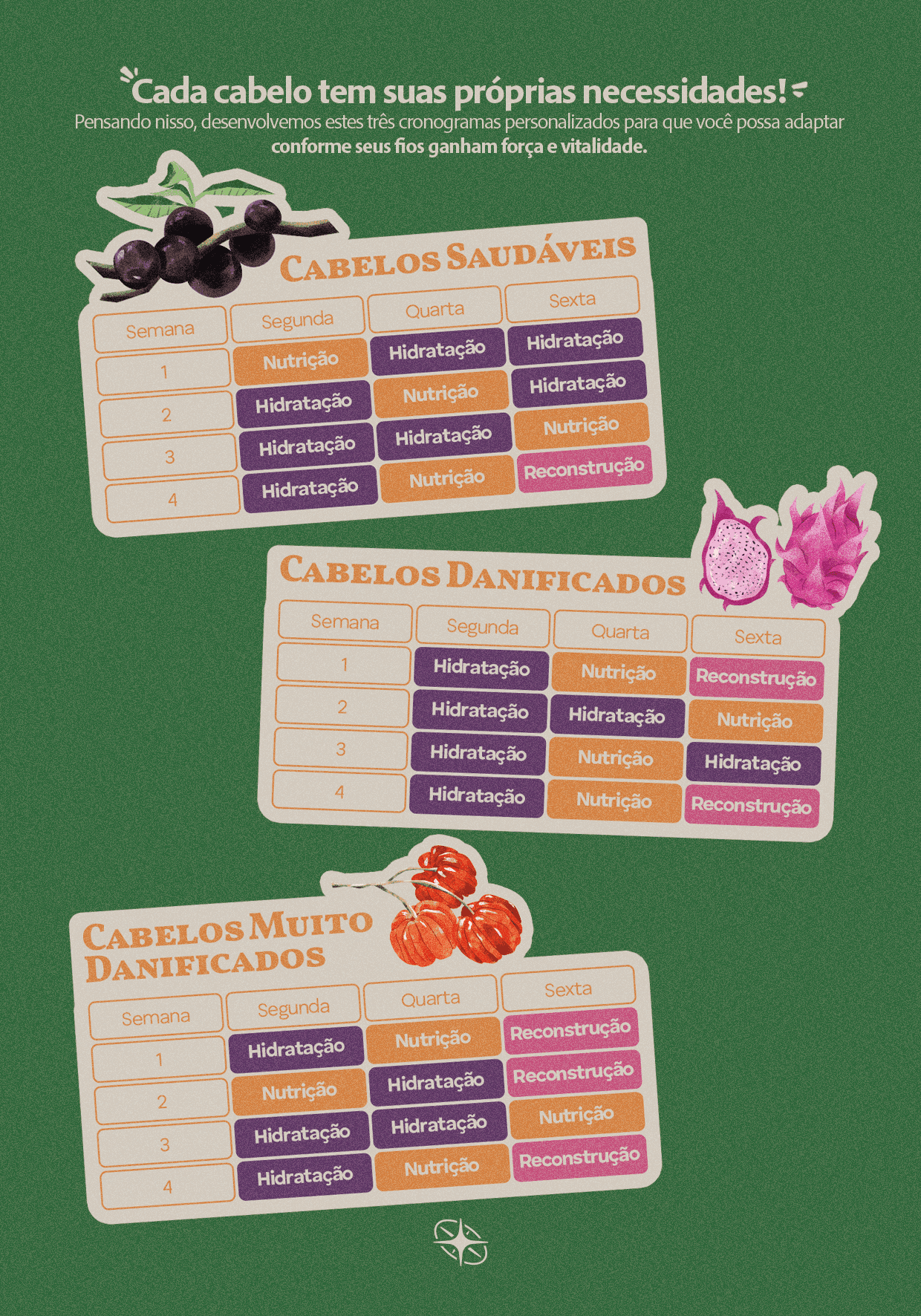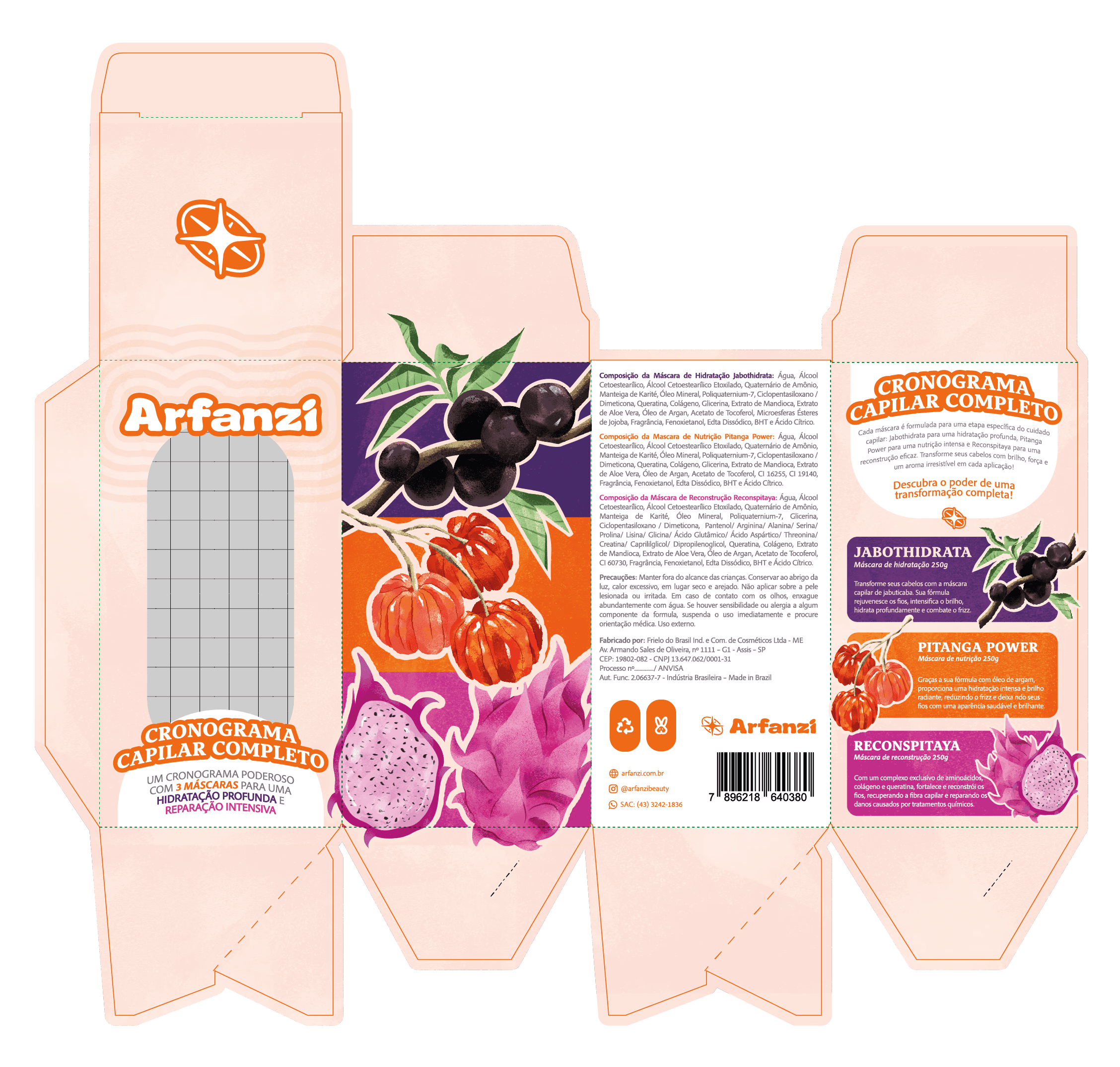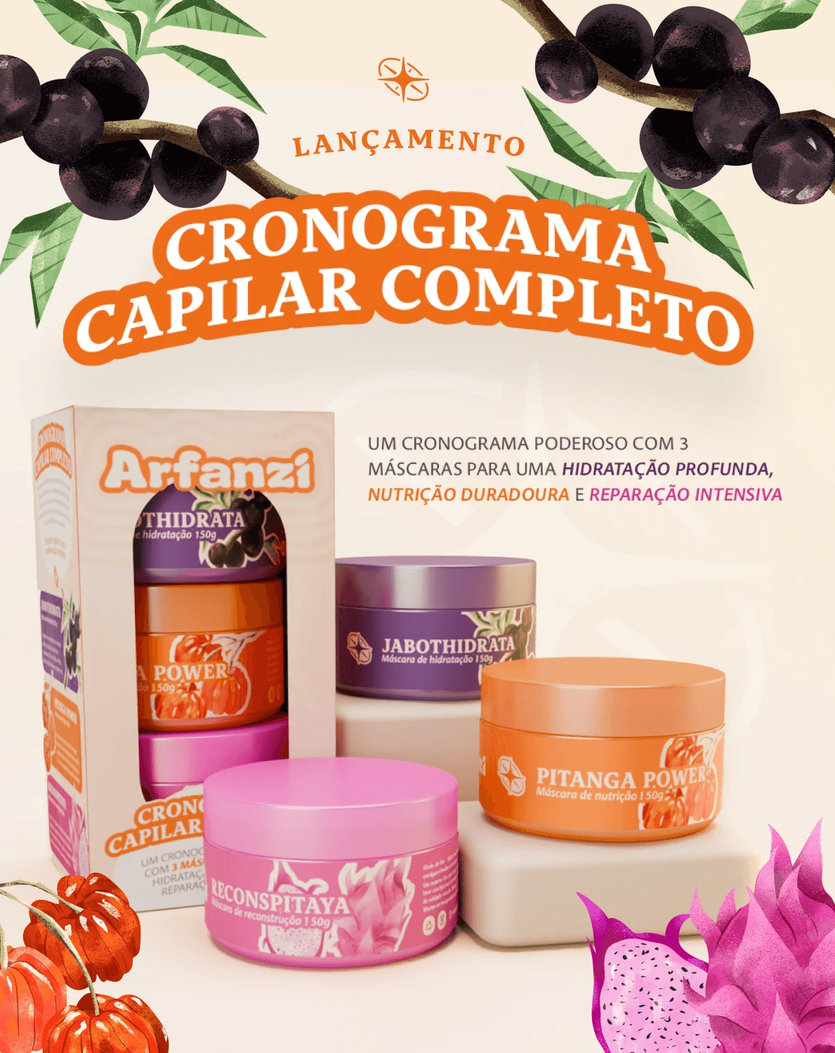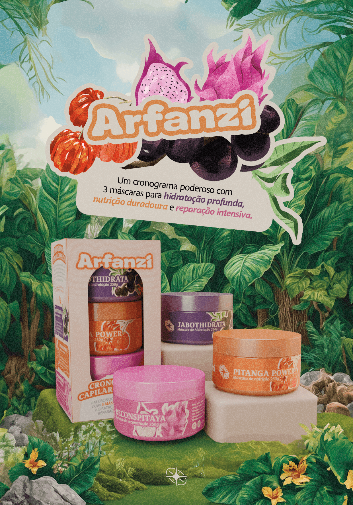 O Cronograma Capilar Arfanzi nasceu da vontade de criar um sistema de tratamento que fosse ao mesmo tempo eficaz e divertido. A solução veio através de três máscaras com personalidades únicas: Jabothidrata (hidratação), Reconspitaya (reconstrução) e Pitanga Power (nutrição), nomes que brincam com frutas brasileiras e suas funções capilares.